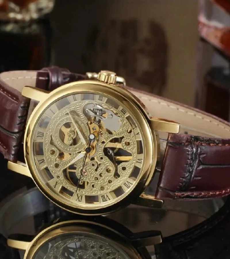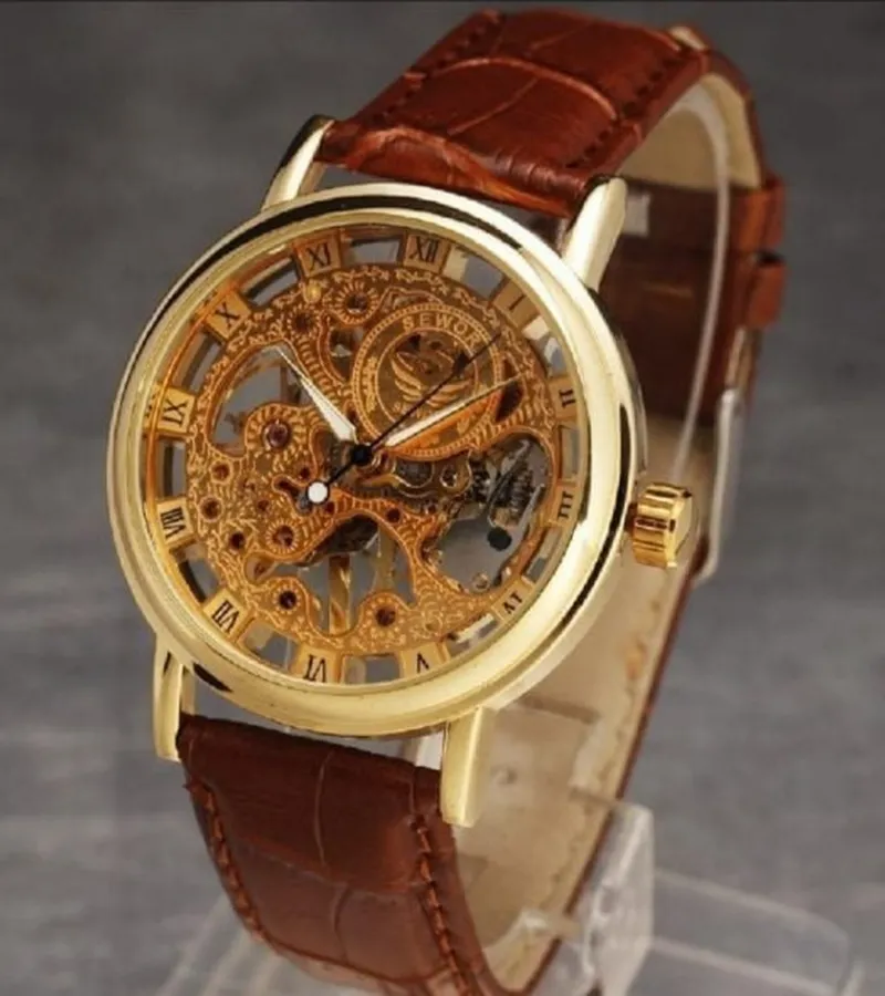 This eye-catching timepiece features a gold-tone stainless steel dial that pairs beautifully with a rich brown genuine leather strap, offering a look that’s both refined and versatile. Whether you’re dressing up for a meeting or a night out, this watch adds a touch of confidence and class to your outfit.