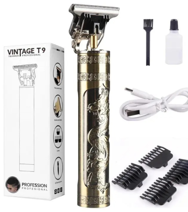 T9 Vintage Metal Trimmer – Durable, cordless hair clipper with titanium blades, USB charging, and 60-minute runtime. Perfect for precise haircuts and beard styling