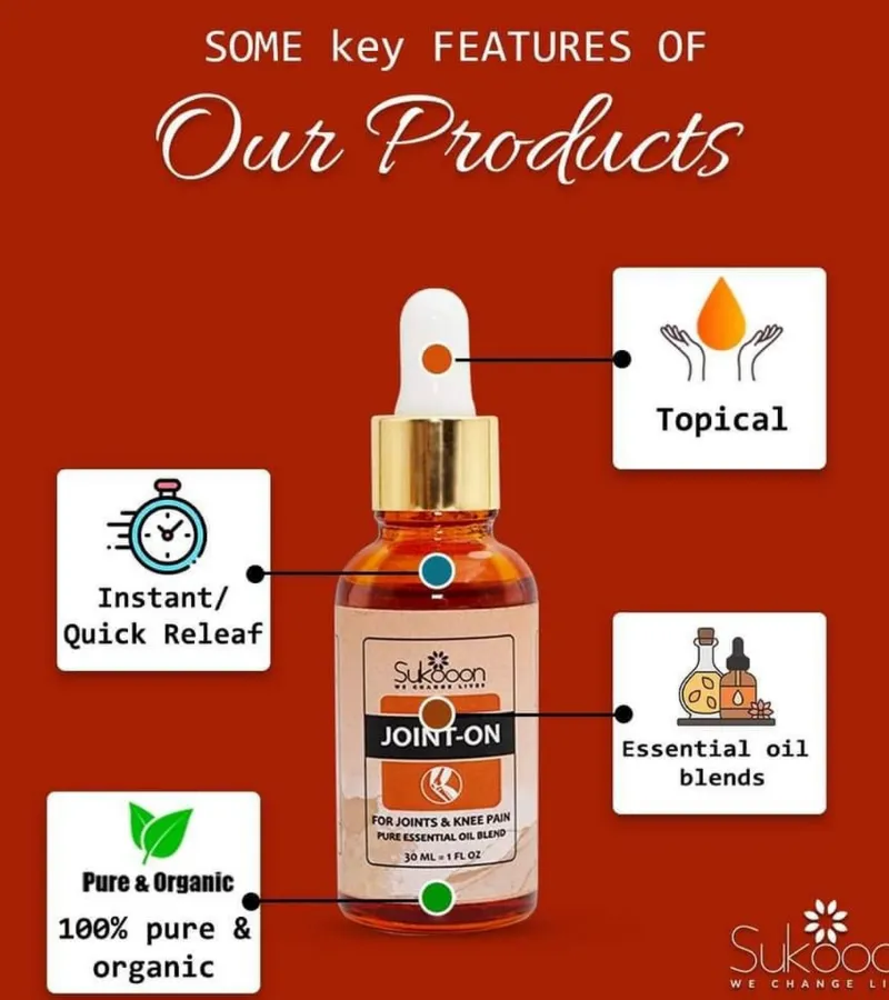Apply 5–7 drops of Joint-On Essential Oil Blend to the affected area and massage gently until fully absorbed. Use 2–3 times daily for best results.